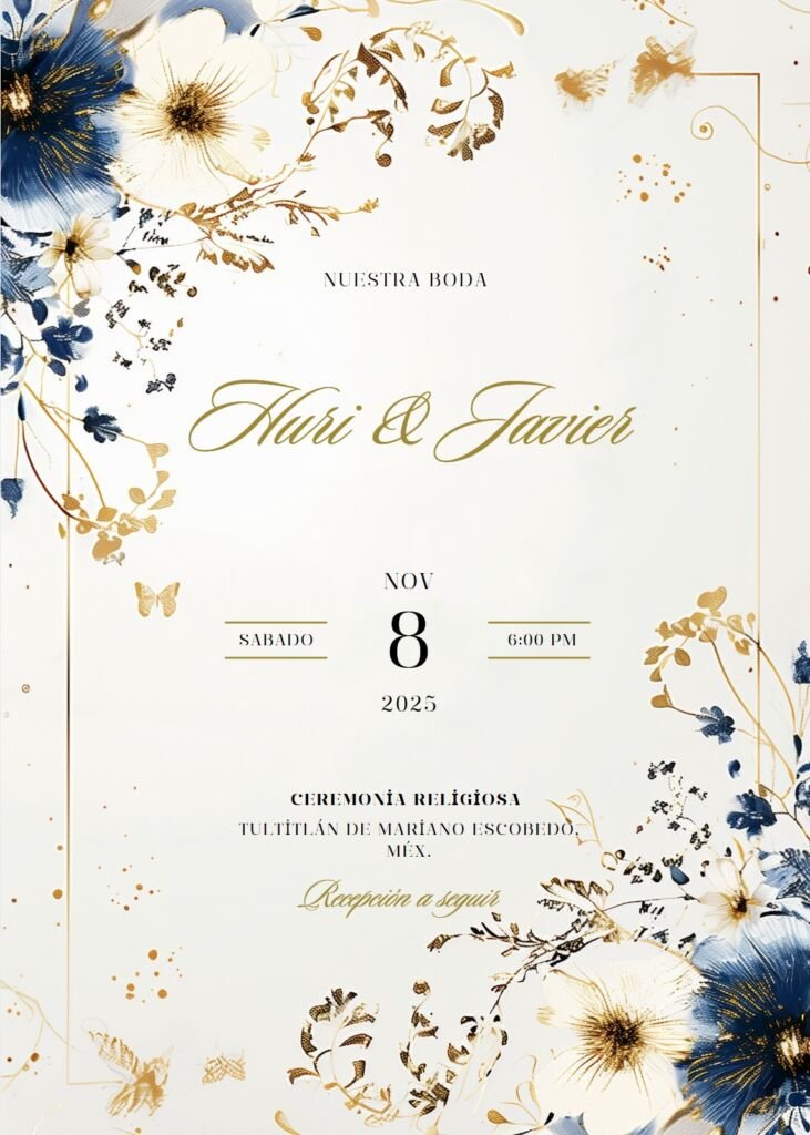 !Nos Casamos¡ Estamos felices por el amor que nos une. Queremos que seas parte de este momento tan importante. ¿Cuándo y Dónde? 8 de noviembre de 2025 Dias Horas Minutos Segundos Ubicación Ceremonia religiosa Centro, 54900 Tultitlán de Mariano Escobedo, Méx. Ceremonia religiosa, 6:3o p.m. VER MAPA Recepción Salon Jardin Los Angeles,Av Villa del Carbón S/N, Loma de Los Angeles, Lomas de Los Angeles, 54710 Cuautitlán Izcalli, Méx. Recepción, 8:30 p.m. VER MAPA Mesa de regalos "También puedes llevar tu regalo en físico" IR A MESA DE REGALOS Código de Vestimenta FORMAL “Agradecemos evitar el uso de blanco o colores muy claros en su vestimenta.” RECOMENDACIONES ¿Asistirás? Por favor confirme su asistencia Por favor, activa JavaScript en tu navegador para completar este formulario.Por favor, activa JavaScript en tu navegador para completar este formulario.Firma *AsistiréLo siento, no asistiréNombre *NombreApellidosWhatsapp *¡Felicita a los noviosEnviar tu RSVP “Realizado por ArtPix – Fotografía & Video”